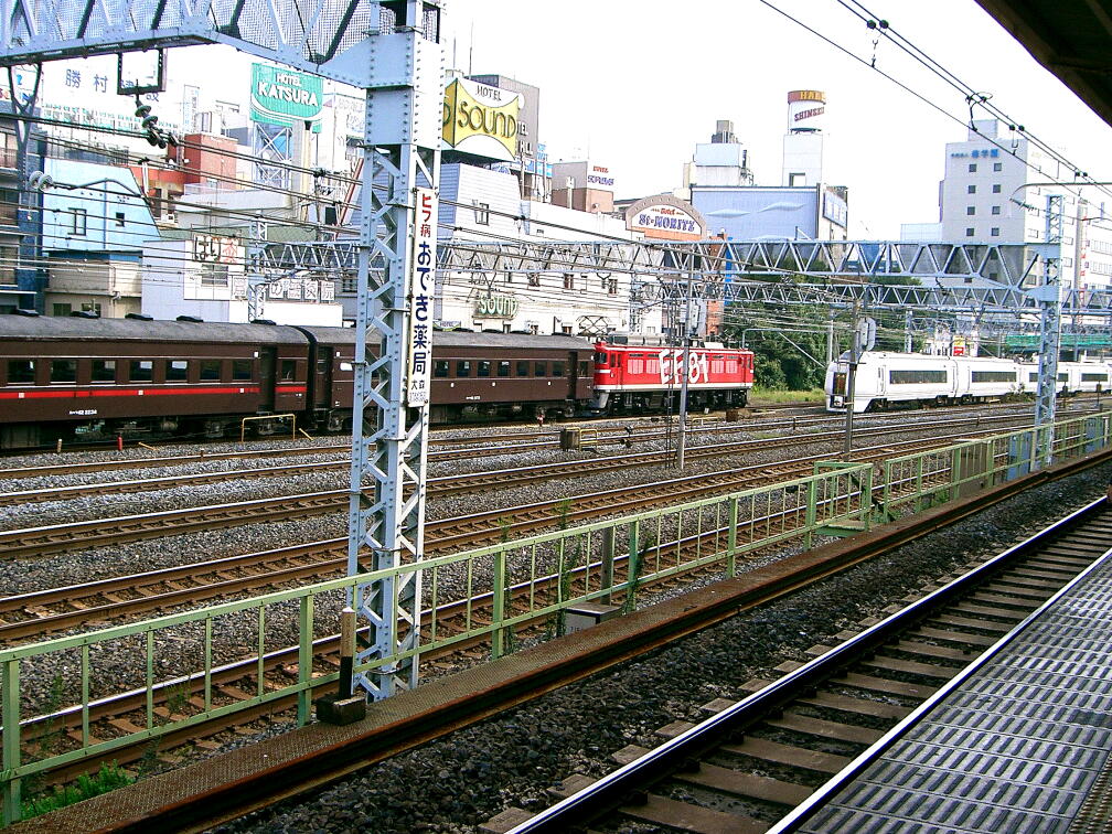 鶯谷駅ホーロー看板と旧型客車